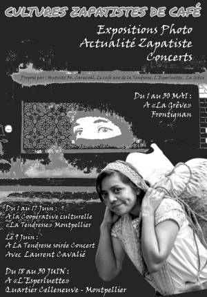 Concert? Projection? Nous avons une exposition zapatiste dans le réseau, commençons par là: on envisage de demander l'expo pour le mois de mai, pour deux lieux, la Tendresse à Montpellier et la Grève à Frontignan, autres?