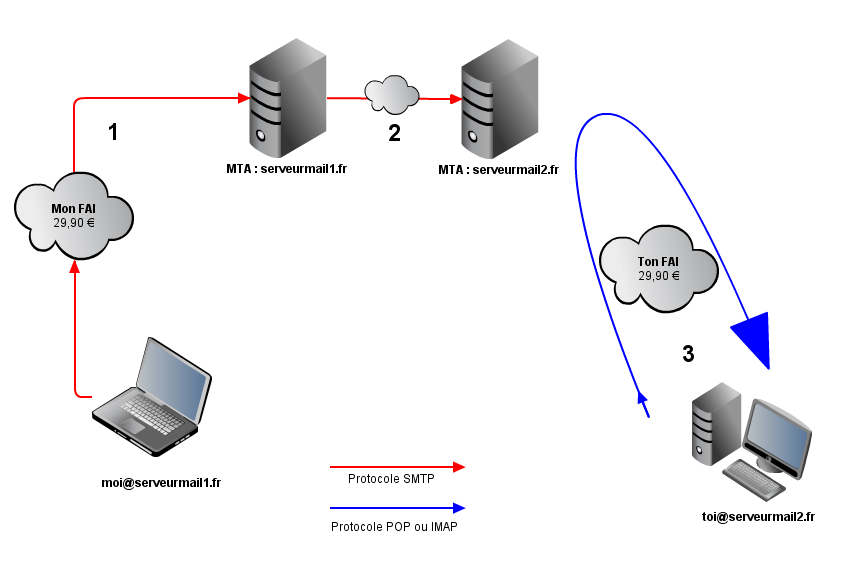 - Le MUA (Mail User Agent ou client de messagerie) de l’expéditeur envoie par le protocole SMTP le message à son MTA (Mail Transfer Agent ou serveur de courrier qui n'est pas forcement celui de son fournisseur d’accès.